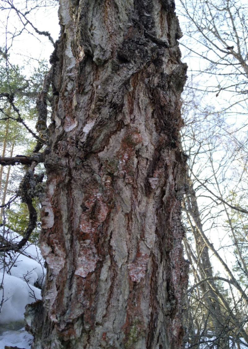Loimukoivun tunnistaa monesti rungon paksusta, tummasta kaarnasta sekä pystysuuntaisista halkeamista.