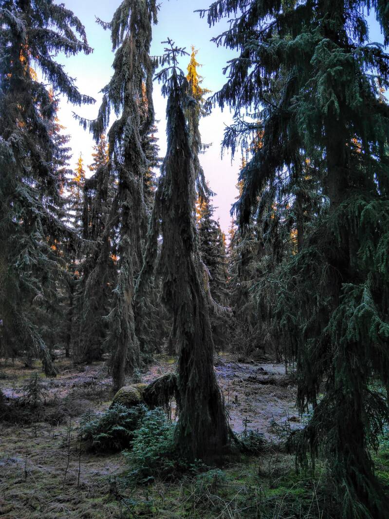 Tiheäkasvuinen kuusen tuulenpesä Iitin Koskenniskan arboretumin alueelta.