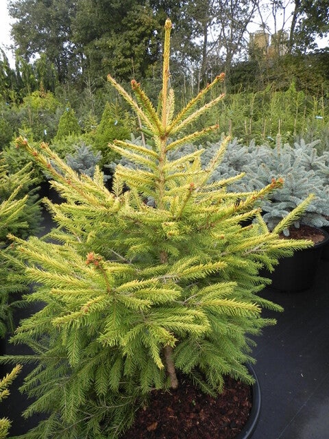 Pensasmainen, kartiomainen kultakuusi muoto, jonka uusi kasvu on keltaista.